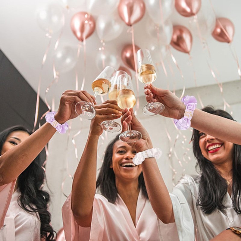 - Bachelorette party favors set: You will receive 8 pieces of satin scrunchies ,including a white one embroidered with "bride" in gold and 7 pcs purple embroidered with "team bride" for bridesmaid
