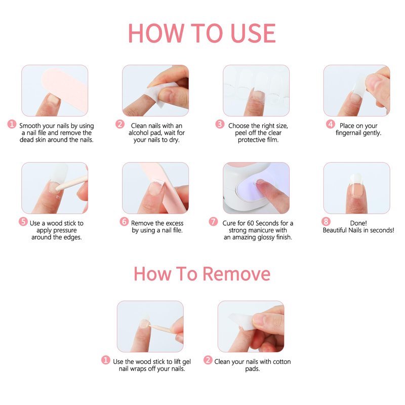 - Salon-Quality UV Gel Nail Strips : Includes 2 Prep Pads, Nail File & Wooden Stick, This UV Gel Nail Stickers That Are Easy To Apply And Remove, Giving You The Perfect Solution For Achieving Long-lasting, Salon-worthy Nails In The Comfort Of Your Own Home.