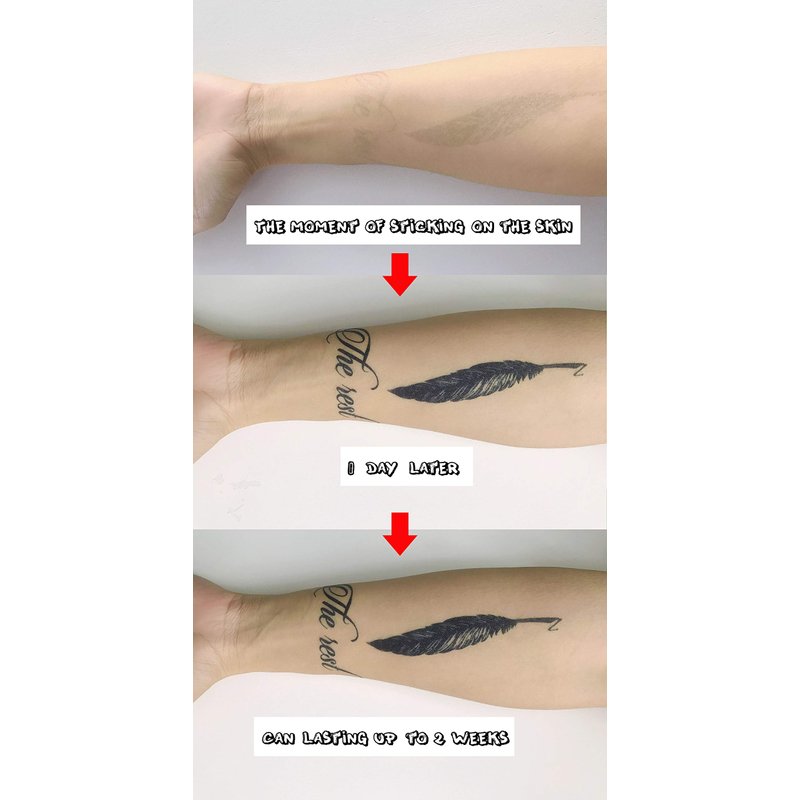Features of Semi-Permanent Temporary Tattoos 1. Semi-permanent tattoo. A revolutionary product comparable to real tattoos. 2. 100% plant-based pigment tattoos, safe and natural. 3. After contact with the skin, the oxidatively activated pigment will appear dark blue, which is also the color of a real tattoo. How to Apply 1. Clean and dry skin completely. 2. Cut out design of your choice and remove transparent film. 3. Place the sticky picture side onto the skin. 4. Press damp cloth / sponge against tattoo and hold for 30 seconds. 5. Gently lift corner to check if tattoo is fully transferred. If not, damp and press again. 6. Remove the sticker and leave a shadow layer. The Ink sinks into the top layer of your skin and develops into a dark blue color over 24 hours. How To Remove: Wipe with warm water and rub the tattooed area vigorously. Note 1. Not recommended for children under 3 years old. 2. Do not use on sensitive skin. 3. Never place inside your mouth or near your eyes. 4. Can’t be cleared immediately and fades as your skin naturally regenerates.