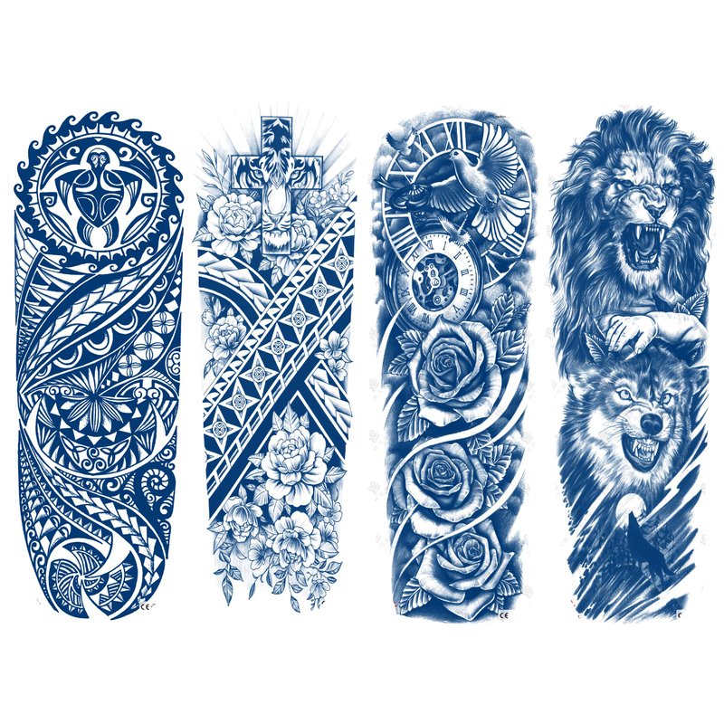 - Diverse Designs: Each pack includes 4 full arm tattoo stickers featuring a variety of symbolic elements, including totems, flowers, crosses, birds, wolves, and lions. Express your unique style with our diverse range of artistic designs.