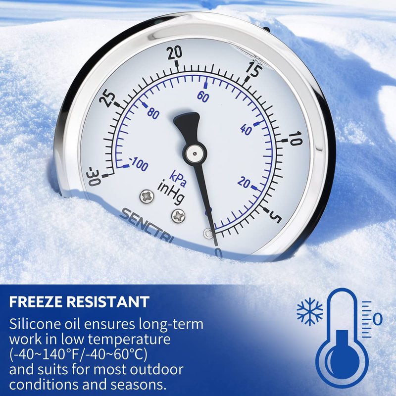 Brass and Stainless Steel wetted parts for measuring non-corrosive liquid and gas pressure. Such as water, oil, air pressure test. Compatible with air conditioning line repair, tank, hvac tools, air pump, pipe, tube vacuum test and etc.. Circular dial is enclosed in a 304 stainless steel case for corrosion resistance. Liquid filled inhibits pointer flutter and prevents damage to the internal mechanics from vibration and pulsation. Silicone oil ensures long-term work in low temperature(-40~140℉/-40~60℃) and suits for most outdoor conditions and seasons. Measures pressure with dual scale (-30-0 inHg/-100-0 kPa). Display accuracy is + or - 3/2/3% over the entire range of the gauge IP65 waterproof prevent condensation inside caused fogging of the window. Offer clear reading.