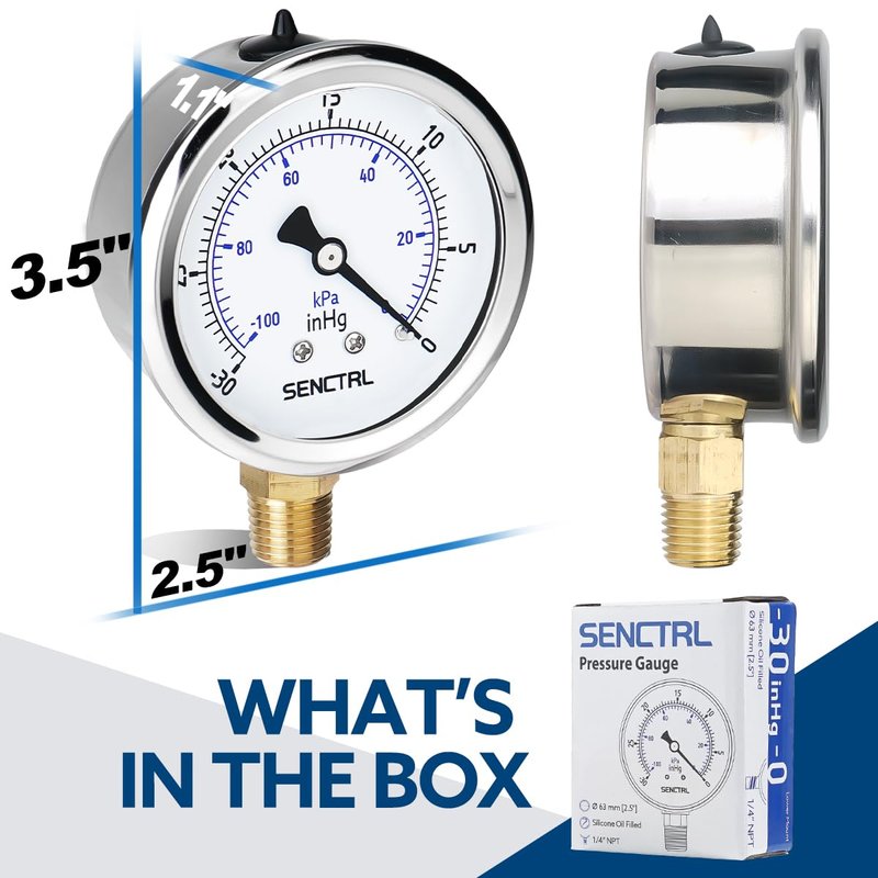 SENCTRL 30 inHg Vacuum Silicone Oil Liquid Filled Low Pressure Gauge, 2.5" Dial Size, 1/4" NPT Lower Mount, Stainless Steel Case, for Air Conditioning Manifolds, HVAC, Air Pump Vacuum Test