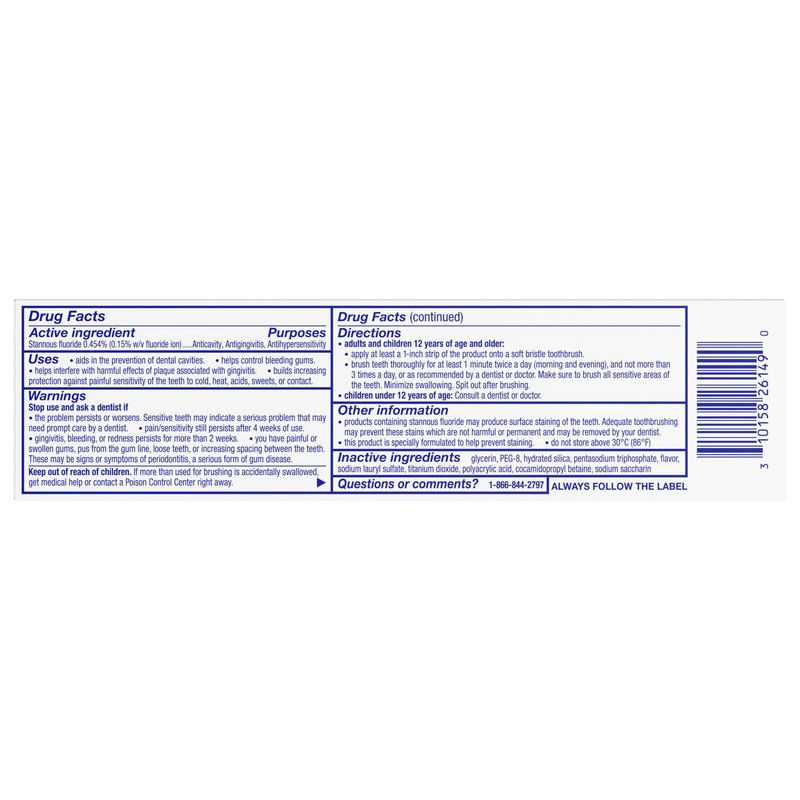 No.1 dentist recommended brand. Fluoride toothpaste for sensitive teeth, antigingivitis and cavity prevention. Improves gum health. Tooth sensitivity & gum problems? Many people with sensitive teeth also have gum problems. Tooth sensitivity can occur when exposed dentin comes into contact with cold, hot, sweet and sour. Early gum problems are caused by a build-up of plaque bacteria, which can lead to redness, swelling, and bleeding. Sensitive areas and swollen, bleeding gums. Builds a protective layer over sensitive areas. Targets and helps remove plaque bacteria. Relieves tooth sensitivity (with twice daily) and improves gum health. Why use Sensodyne Sensitivity & Gum? Sensodyne Sensitivity & Gum contains a clinically proven ingredient to relieve tooth sensitivity and improve gum health. It builds a protective layer over sensitive areas, effectively relieving tooth sensitivity. It targets and removes plaque bacteria associated with gingivitis, to help reduce swollen, bleeding gums. You can deal with both these concerning problems with one specialist toothpaste. Sensodyne Sensitivity & Gum is a daily fluoride toothpaste. Dual action for tooth sensitivity & gum problems. Questions or comments? 1-866-844-2797.