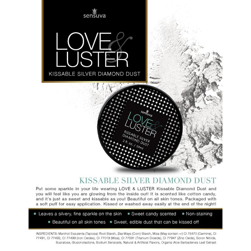 - LIGHT TEXTURE, NATURAL SHINE & KISSABLE!: Put some sparkle in your life wearing Sensuva’s LOVE & LUSTER Kissable Diamond Dust and you will feel like you are glowing from the inside out! It is lightly scented like cotton candy, and it’s just as sweet and kissable as you! Packaged with a soft puff for easy application. Kissed or washed away easily at the end of the night!