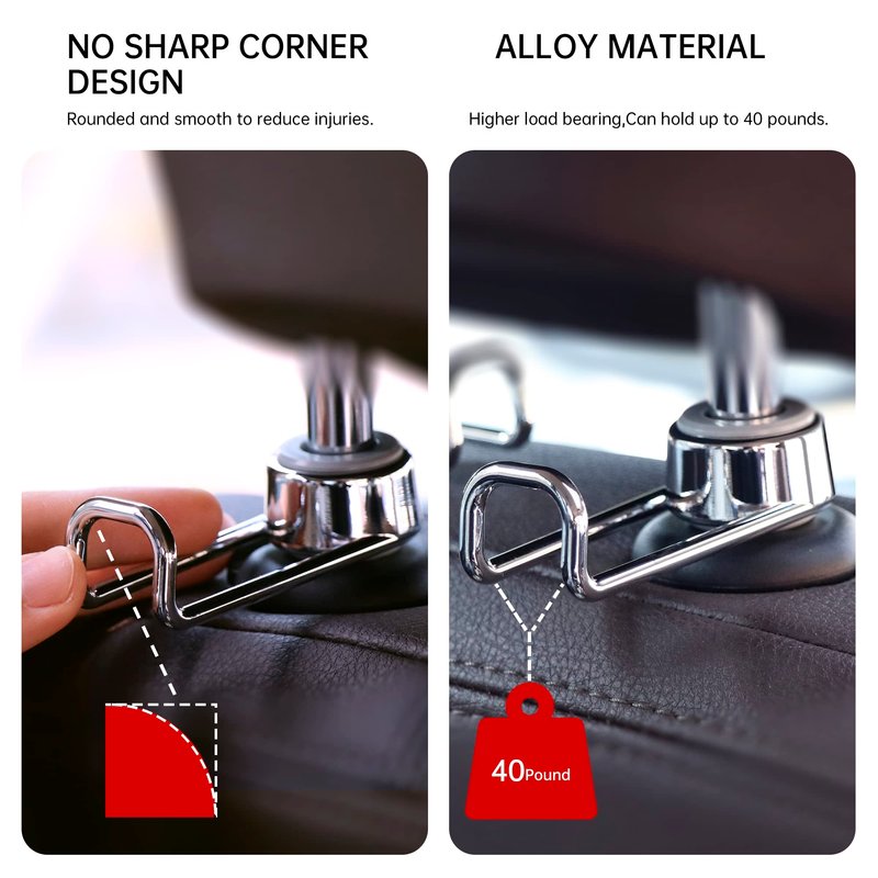 - UPGRADE MATERIAL:hidden headrest hooks for car the use of high-quality alloy material, durable, not easy to bend deformation and wear, can withstand 40 pounds of weight, headrest rod inside the silicone ring anti-slip more stable, more silent, non-destructive installation.