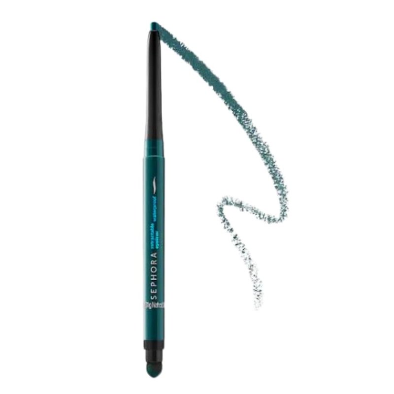 Sephora Retractable Waterproof Eyeliner - 27 Matte Deep Green (Deep Forest Green) - 0.011 oz/ 0.31 g. What it is: Waterproof, smudge-proof, creamy eye liner pencil. Create a pop of color in a matte finish. Includes built-in sharpener and smudger. What Else You Need to Know: Liner pencil never skips or tugs at eyelids. Use smudge tip to blend the "set and stay" formula for a perfect smoky eye. Or for an ultra-precise line, apply with freshly sharpened tip. Long-lasting wear.