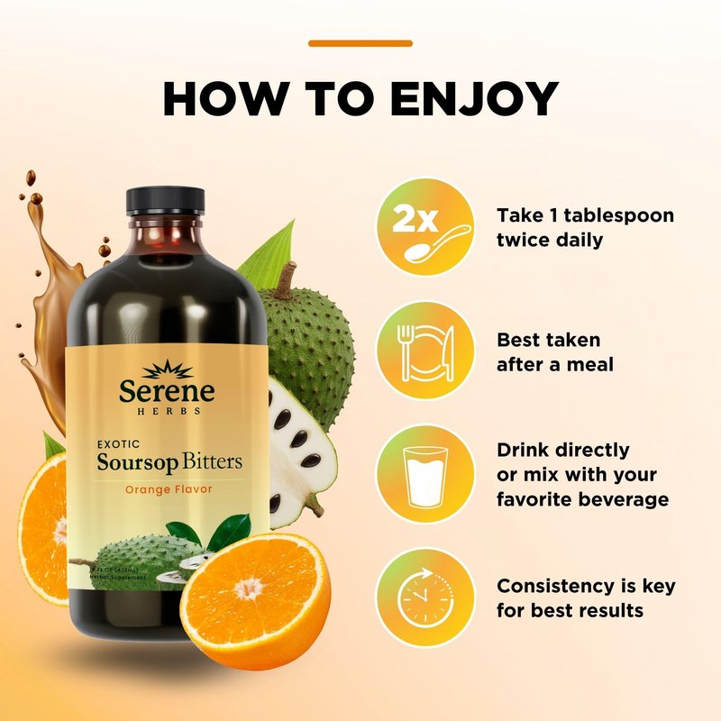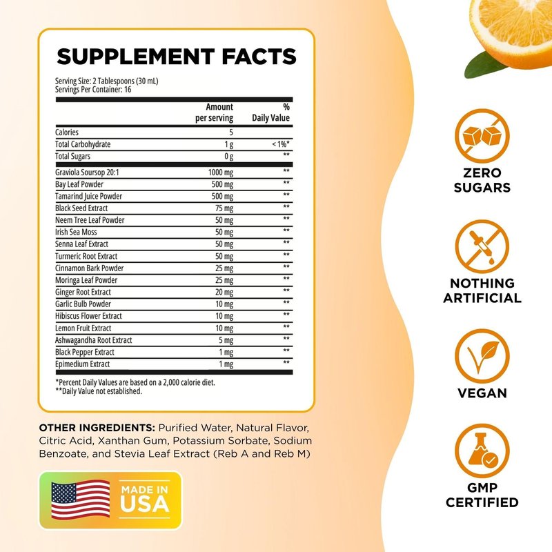 Serene Herbs Soursop Bitters Liquid with Soursop Leaves for Gut Cleanse, Detox & Immune Boost with Black Seed, Moringa, Irish Moss, Ashwaganda, Turmeric, 16 fl oz (16 Fl Oz, Orange)