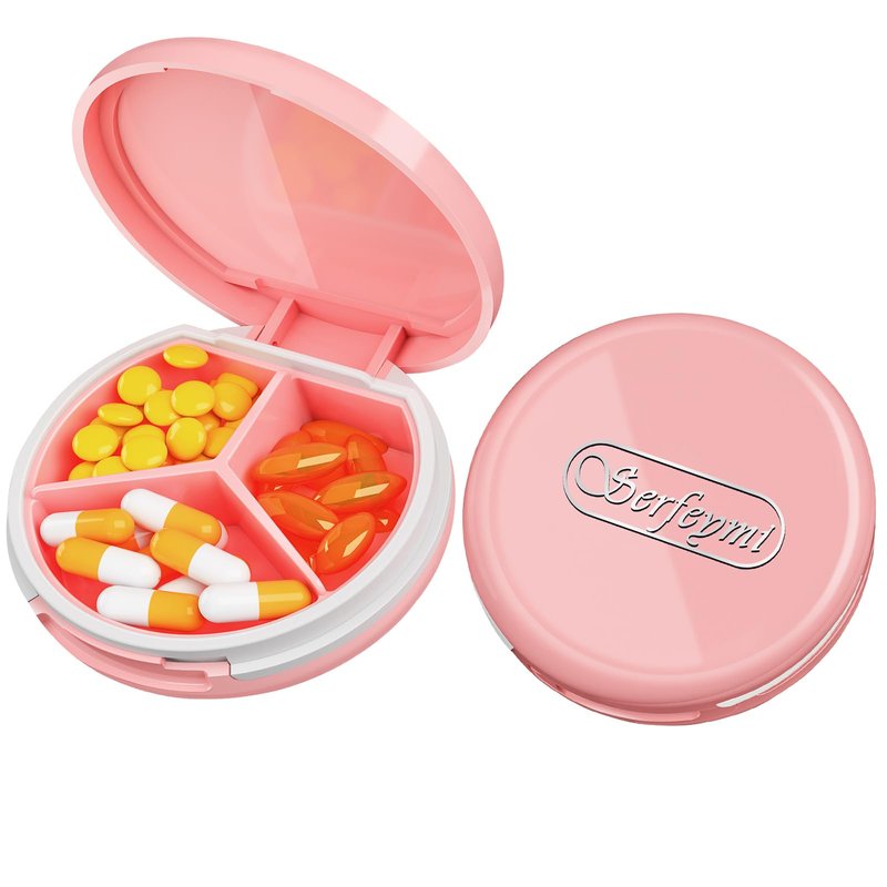 Serfeymi 3 Compartment Waterproof Cute Small Pill Box for Purse & Pocket,Travel Portable and Multifunctional Pill Case Holder for Vitamins, Fish Oil, Supplements, Pearls-Pink