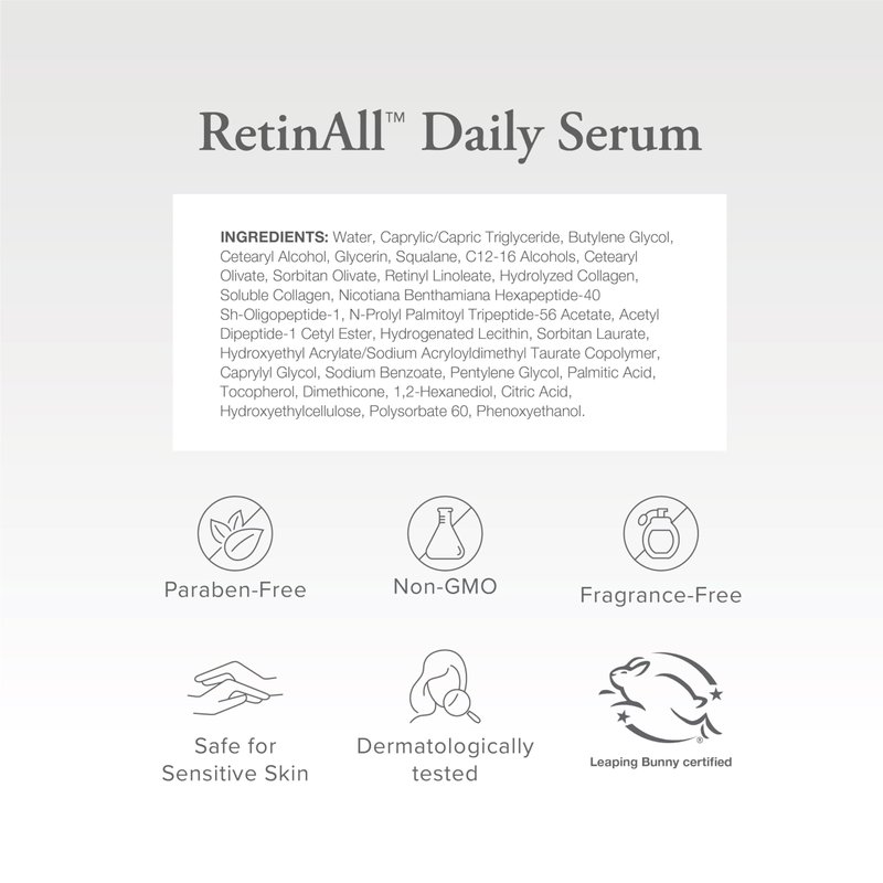 RESULTS WITHOUT NEEDLES No Expensive Clinic Visits Required This potent face serum lets you harness the power of a retinoid compound, epidermal growth factor, peptides, and squalane. It reduces the look of wrinkles, visibly lifts sagging skin, improves the appearance of elasticity, and visibly brightens. If you’ve tried retinol products in the past and had to give up because of irritation or redness, we have your solution. RetinAll Daily Serum includes a retinoid bound with squalane, vitamin E, and linoleate – an essential skin nutrient – for a retinoid compound clinically shown to hydrate the skin. In a clinical trial, 100% of participants had no irritation. Unlike many retinoid formulas, RetinAll Daily Serum also includes peptides to visibly lift sagging skin. This unique anti-aging face serum hydrates as it visibly lifts, brightens, and targets the appearance of even the most difficult wrinkles: deep wrinkles on delicate, sensitive skin. BENEFITS + Reduces the look of wrinkles + Visibly lifts sagging skin + Improves the appearance of skin elasticity + Restores hydration + Visibly brightens skin This retinoid serum also supports cellular turnover and reduces the appearance of 4 types of wrinkles: + Marionette lines + Frown lines + Nasolabial folds + Crow’s feet RetinAll Daily Serum is free from parabens and formaldehyde, including traces. It is formulated without phthalates, mineral oil, gluten, synthetic dyes, sulfates (SLS/SLES), nonylphenol ethoxylates, oxybenzone, retinyl palmitate, hydroquinone, triclosan, triclocarban, BHA, and BHT. Plus, it is made in the USA with globally sourced ingredients following Good Manufacturing Practices. To use this retinoid serum, apply 1-2 pumps all over your face and neck. Smooth gently into your skin. Use AM and PM. For daytime use, always finish with your favorite SPF.