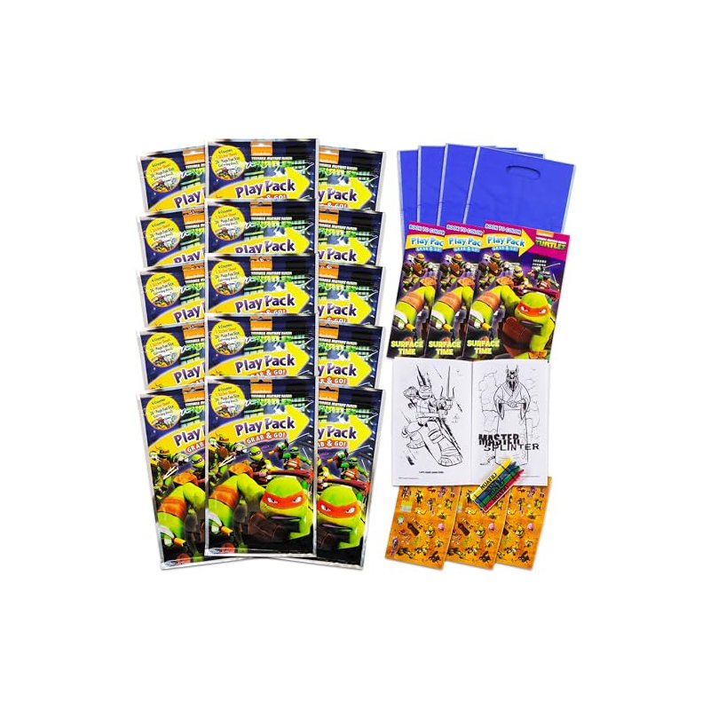 Set of 15 Playpacks. Each Playpack contains 1 childrens mini coloring book, 4 crayons, and 25 stickers. Children’s TV & movie characters for boys & boys. Teenage Mutant Ninja Turtles art coloring book set features favorite characters like Raphael, Michelangelo, Leonardo, and Donatello. Toddler coloring books Grab and Go fun for car travel & vacations. Fun for holidays, Easter basket, birthdays, and prizes. Cool party favors, supplies, art gifts, and presents. Good grade school toddler coloring book for classroom rewards and giveaways making it the best coloring book set. Kids coloring books activities for daycare, camp, parties, pre-school, kindergarten, birthday parties, coloring books for kids sleepovers, etc. Fun for boys and boys. Bulk set in resealable bags, ages 3+, especially popular party favors for kids under 5. Officially licensed Teenage Mutant Ninja Turtles toys and games products also comes with blue loot bags.
