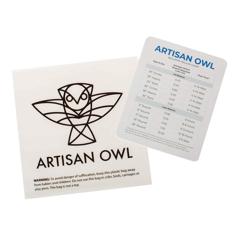 - Every package comes with an Artisan Owl Balloon Helium Chart and is shipped in our trademarked packaging to ensure quality.
