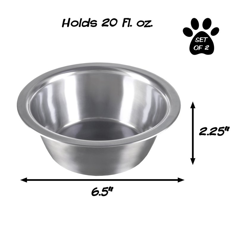 - PRODUCT DETAILS - Materials: Stainless-Steel and Chromed Iron. Dimensions: (L) 6.5” x (H) 2.25”. Holds 20-Ounces Each. Set of 2 Dog Dishes.