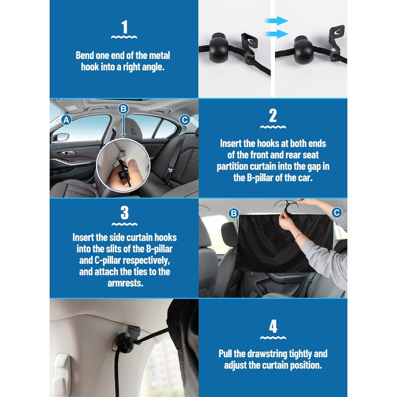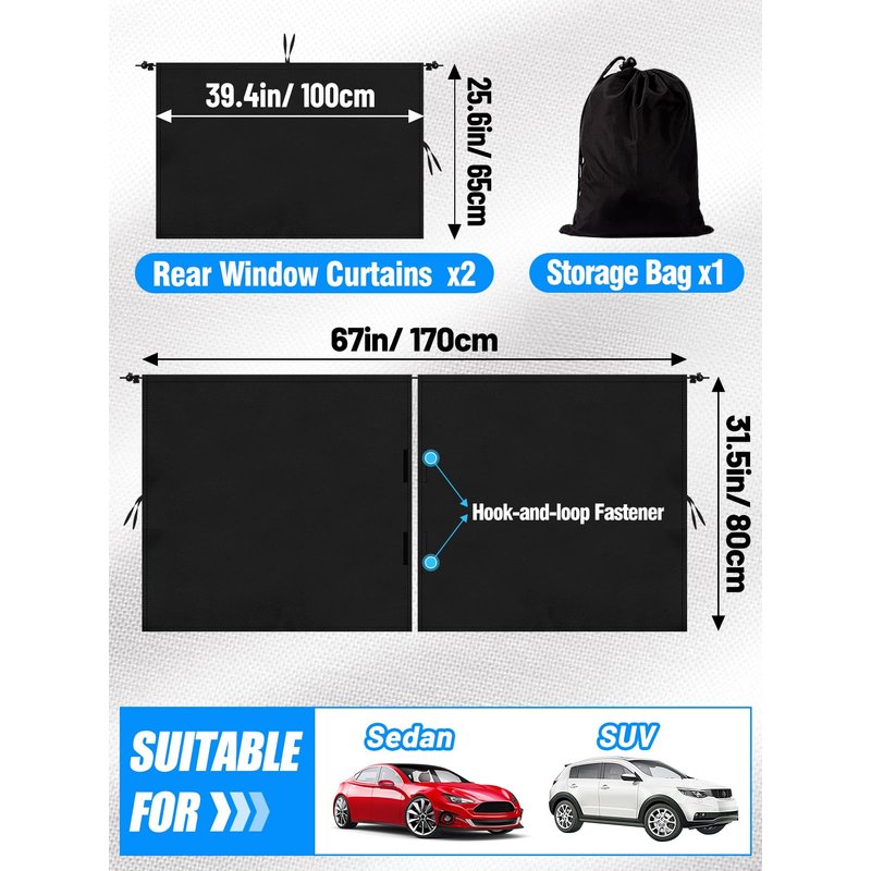 - 【Suitable for Various Cars】The size of our long partition curtain is: 170 * 80 cm / 67 * 31.5 in, and the size of the two side window curtains is 100 * 65 cm / 39.4 * 25.6 in. The size of our car privacy curtain is widened, larger than the ordinary curtains on the market, and can be adapted to a wide range of sedans, SUVs, pickup trucks, and other models. The installation is also very simple, please refer to the pictures.