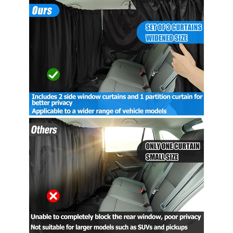 - 【3 Curtain Set】Our products include 1 pcs long rear seat divider curtain, 2 pcs side windows curtains and 1 pcs storage bag. This set of car curtains provides good shade, so you can rest assured that you can enjoy a cool travel time in the back seat of your car. It can also effectively help you make the back seat of your car a perfect private space.