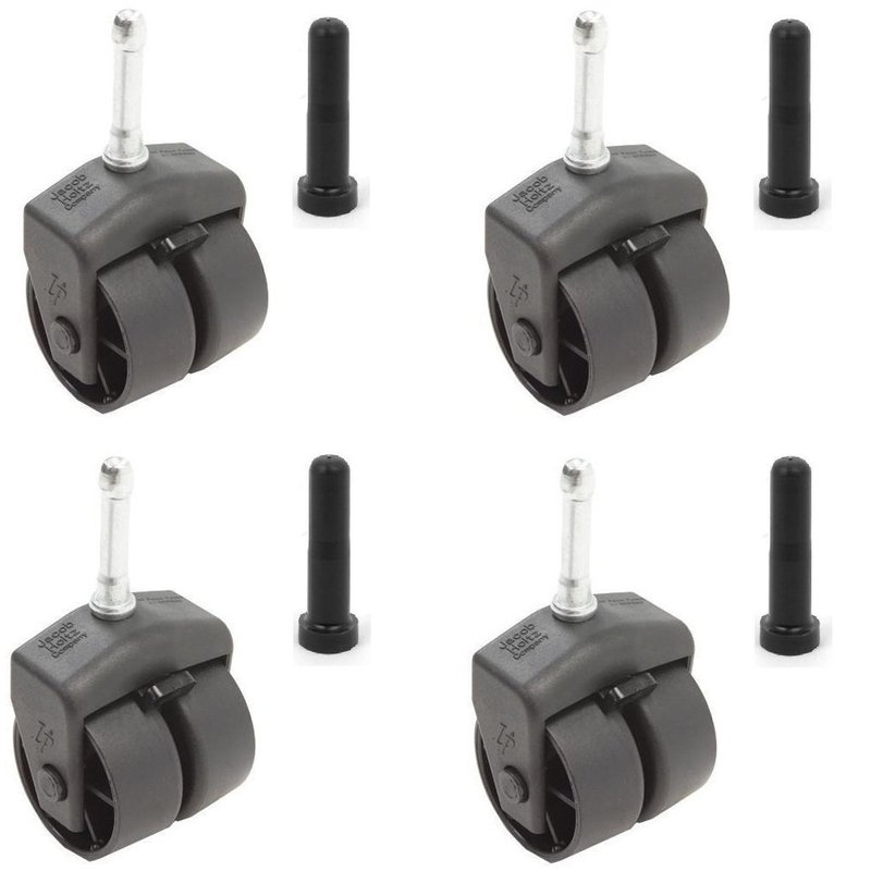 These casters are perfect replacements for your bed frame. The rolling wheels make moving your bed simple while the brakes will keep it in place. 2 x 2 matt finish double wheel bed frame caster with wheel lock brake. Standard mounting stem. Mounting socket for 1/2" diameter hole included. Rated to 150 lbs per caster. Set of 4 casters and 4 sockets.