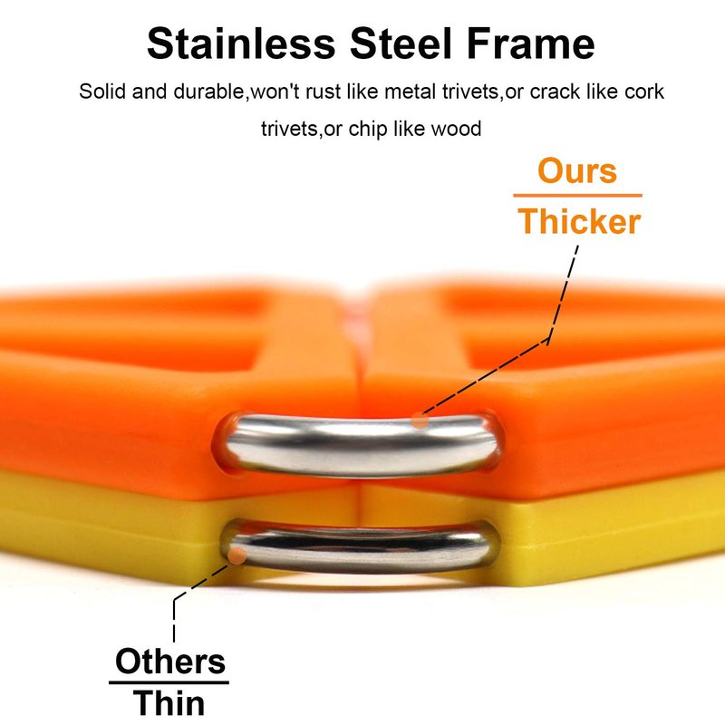 - 【Stainless Steel Frame】Construct of high quality stainless steel frame which is thicker than similar products on the market,makes the whole pot pad more solid and durable,won't rust like metal trivets,or crack like cork trivets,or chip like wood!Non-slip surface prevent the hot pans from slipping;Super thick silicone keeps the pots far enough away from the table and allows the overflowed liquid to stay within the trivet,prevent water splashing;Soft silicone will not scratch your countertop!