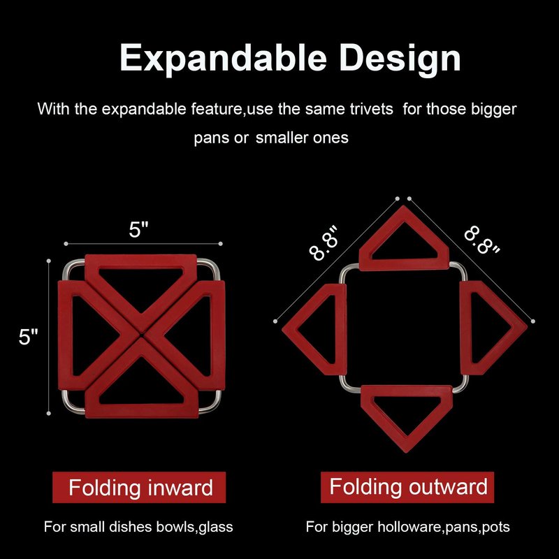 A foldable kitchen trivet makes your life more beautiful,provides a sturdy base for heavy pans to better insulate the kitchen surfaces from heat,protects your table or kitchen counter tops from unsightly burns!