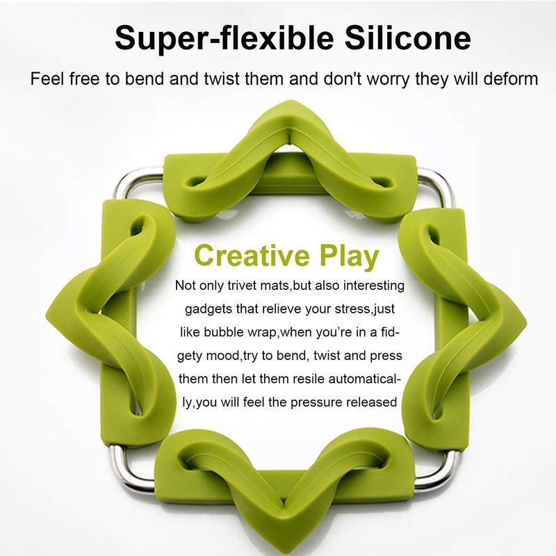 - 【Super-flexible Silicone】The kitchen silicone table mats are super flexible so that you can feel free to bend and twist them and don't worry they will deform.Not only trivet mats,but also interesting gadgets that relieve your stress,just like bubble wrap,when you’re in a fidgety mood,try to bend, twist and press them then let them resile automatically,you will feel the pressure released!Easy to store,just simply fold them and put them away or hang them up to save space!