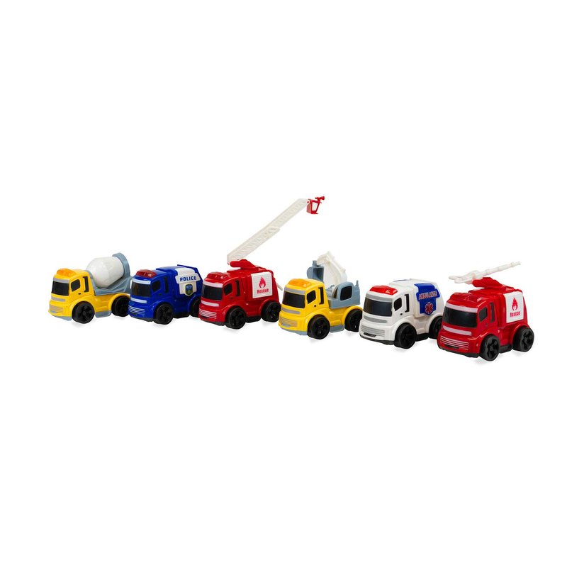 - 【6PCS Toy Truck Set】This Set of 6 Pullback City Builder Toy Construction Vehicles for Kids includes a police car, an ambulance, a fire truck with ladder, a fire truck with hosts, a acrane, a concrete mixer truck, all friction powered, lightweight and travel-friendly size, ideal for kids to play anywhere.
