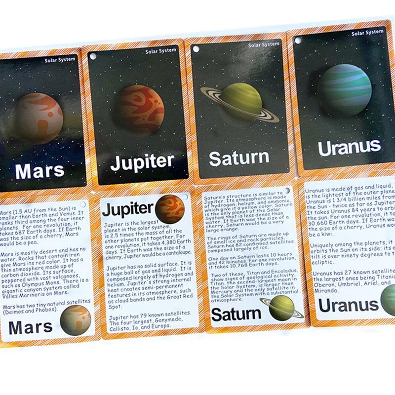 - 【PLAY GAMES】 We described all planets in the solar system with brief descriptions, colorful and interesting pictures on study cards, so they can be used in a funny and exciting class/game and teach kids fun facts about our planets, galaxies, sun, the moon. It is good for teachers, mothers at home, classroom organizations & decorations in kindergarten and daycare.