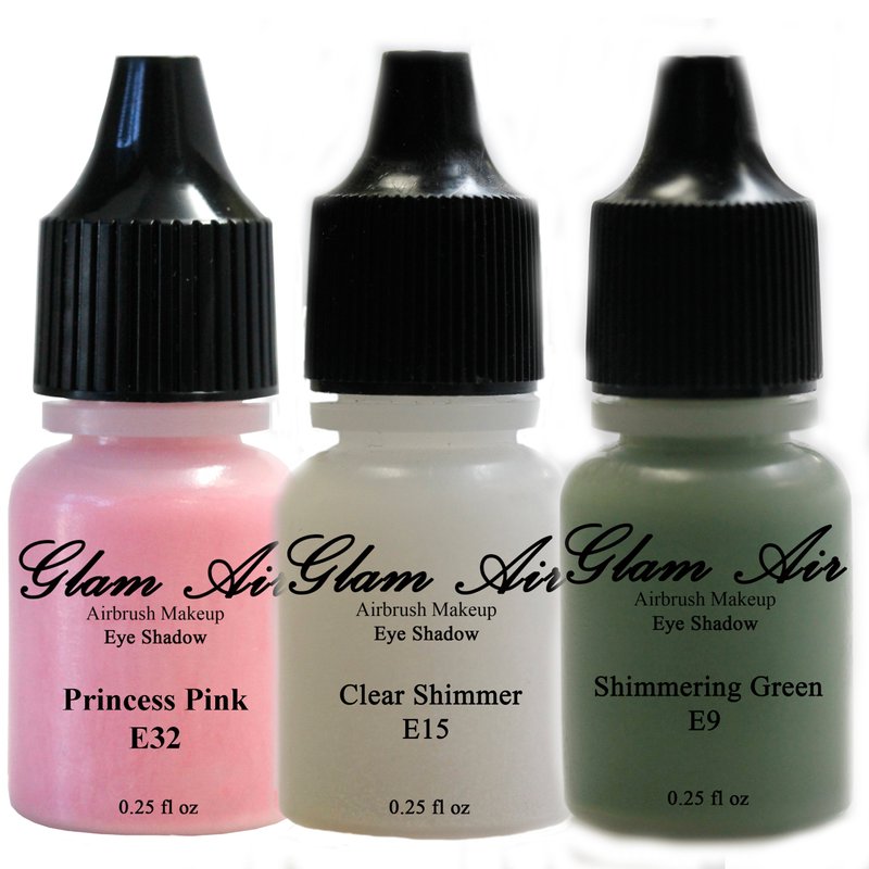 Set of Three (3) Shades of Glam Air Airbrush Eye Shadow Makeup E9 Shimmery Green, E15 Clear Shimmer and E32 Princess Pink Water-based Formula Last All Day (For All Skin Types) 0.25oz Bottles