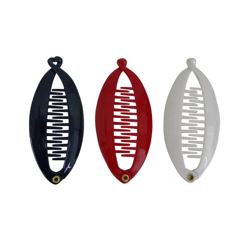 SET OF THREE BANANA CLIPS. This is a popular womens banana clip or hair comb for girls. It measures 3.5 inches long and 1.5 inches wide at the widest point. It is made of durable plastic and comes in lots of fashionable colors. Look great in this banana comb!