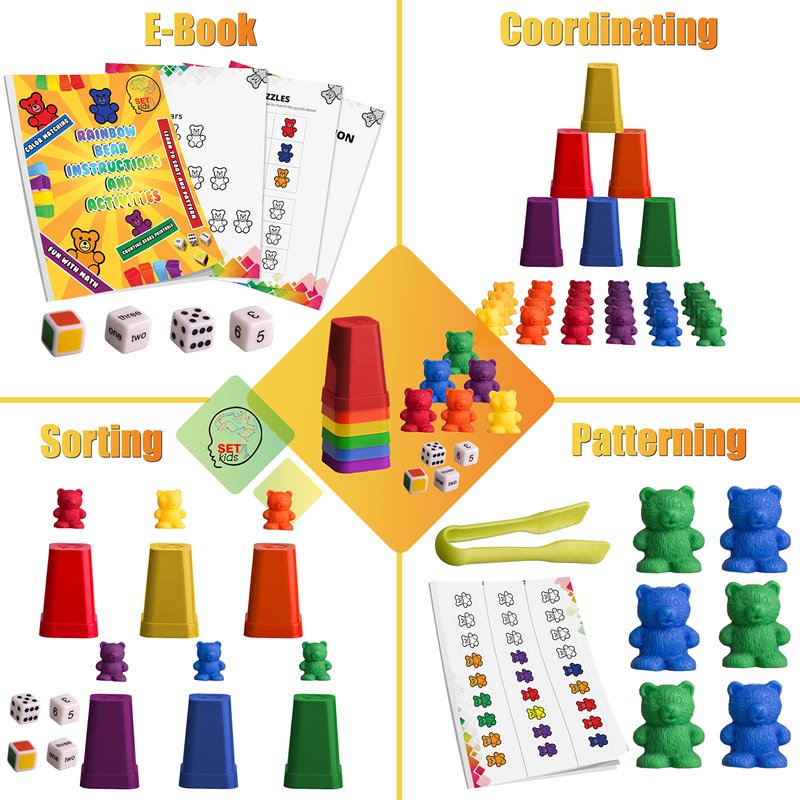 - 🐻MATH MANIPULATIVE - Kids experience MATH LEARNING that is FUN, STIMULATING, MOTIVATING and ENTERTAINING. Kids build CONFIDENCE at a young age by playing math games. Building a SOLID FOUNDATION by playing SET4kids games, can significantly reduce math anxiety later in school For TODDLERS- A GREAT MONTESSORI TOY . Counting colored bears teaches COLOR RECOGNITION, GROUPING and CATEGORIZING which are important skills for toddlers as well as a great brain connections builder