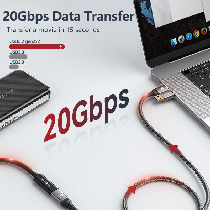 - HIGH-SPEED TRANSMISSION : This USB 3.2 Gen 2x2 cable with 20Gbps high-speed data transmission function . Music and pictures can be transferred quickly in a second , movies and videos can be transferred in seconds , plug and play , no need driver.