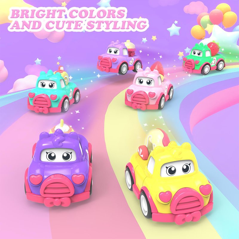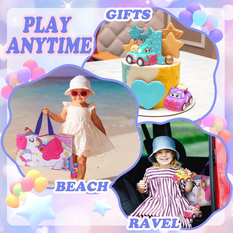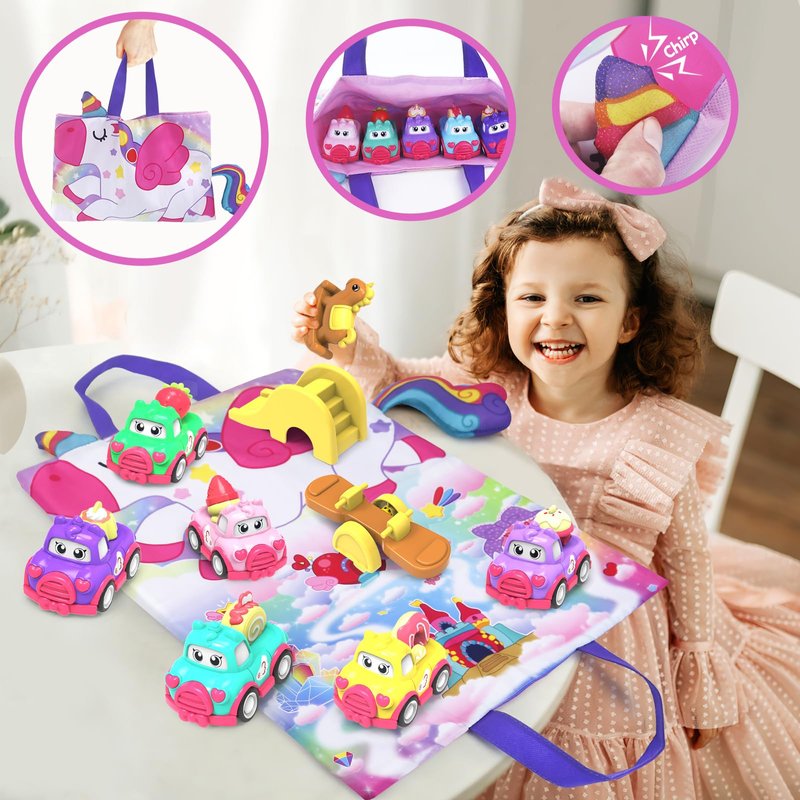- 【10 Girls Cars Toy Set】Contains 6 mini colorful cars, 1 seesaw, 1 slide, 1 Trojans and 1 unicorn storage bag.
