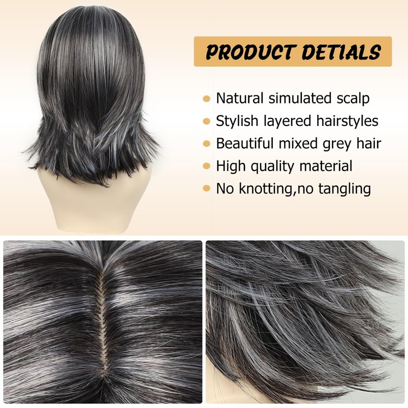 - Stylish Short Layered Bob Wig:Layered Dark Gray Mixed Silver Wigs with Bangs,easy to take care of and shape,cute curtain bangs design can better modify your face shape and hairline,making you more lovely and young.This shoulder length layered wig,carefully trimmed and styled by the designer,will give you an elegant and charming new look immediately.