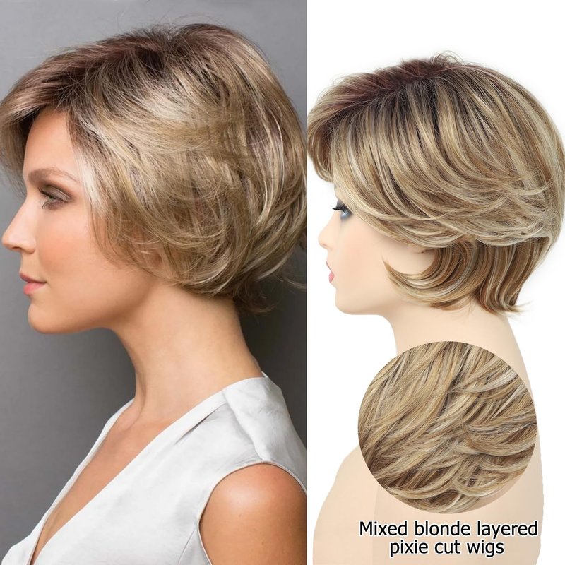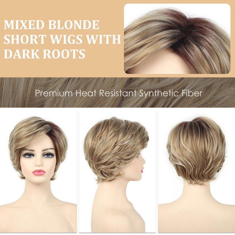 SEVENCOLORS Short Blonde Pixie Cut Bob Wigs with Dark Roots Layered Blonde Wigs with Highlights Natural Looking Synthetic Hair Wigs for White Women