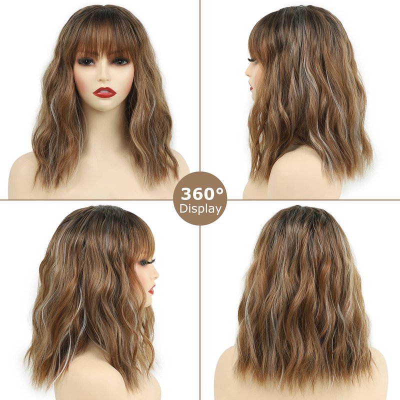 SEVENCOLORS Short Brown Bob Wigs with Bangs Medium Length Brown Mixed Blonde Wigs for Women Wave Curly Synthetic Hair Wigs with Highlights