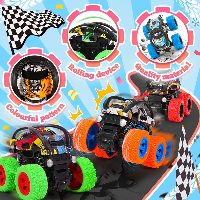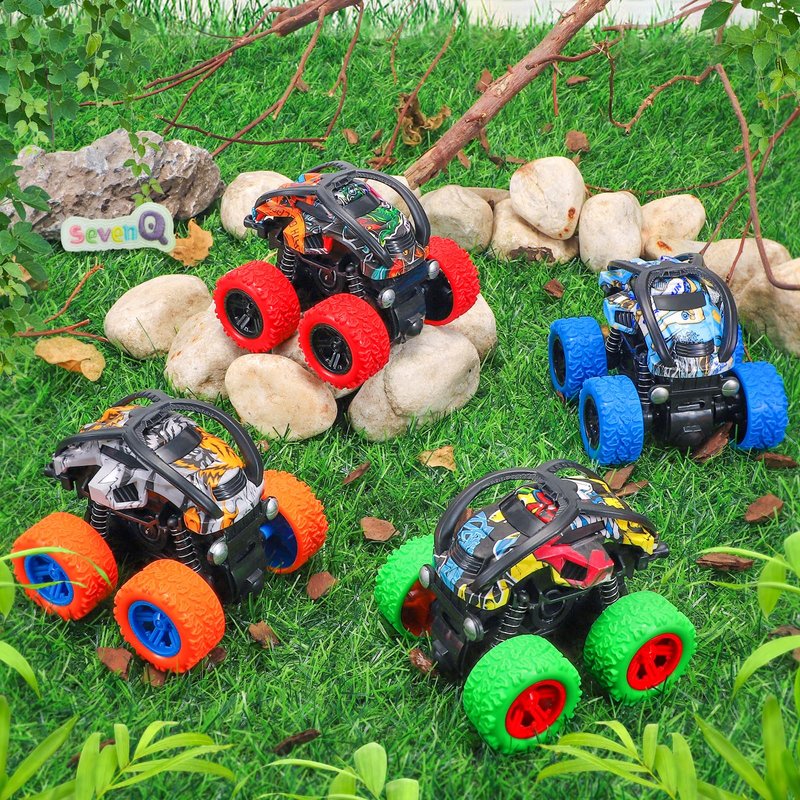 SevenQ Monster Truck Toys Cars for Boys, 4 Pack Race Cars Party Favors for Kids Push and Go Flip Stunt Pull Back Cars, Toddler Toys Classroom Prizes Christmas Goodie Bag Stuffers Birthday Gifts