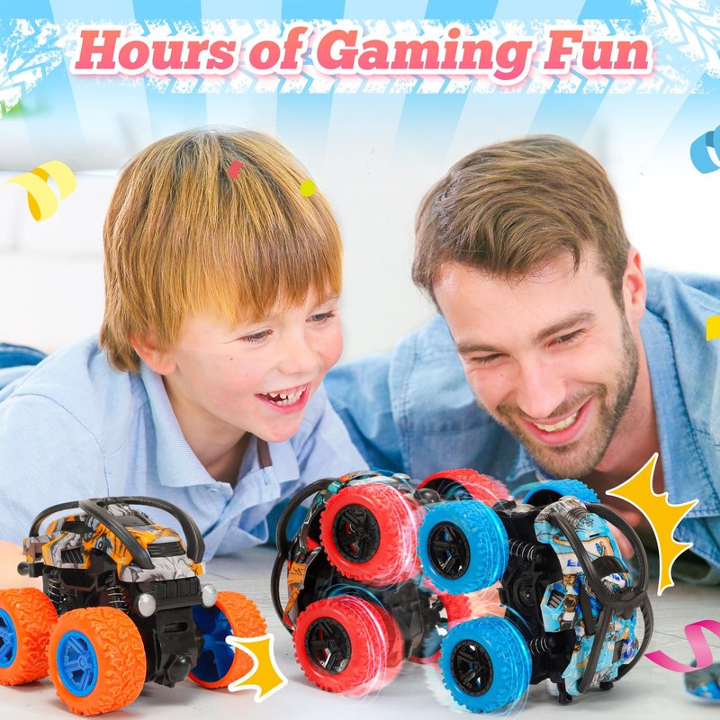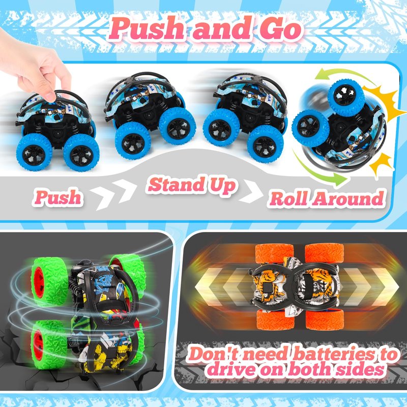 - Push and Go Monster Truck Toys: Experience new toy cars for kids, toy set includes 4 graffiti look double-sided flip cars, amazing stunt flips to attract children's attention, bringing hours of excitement and thrilling adventures