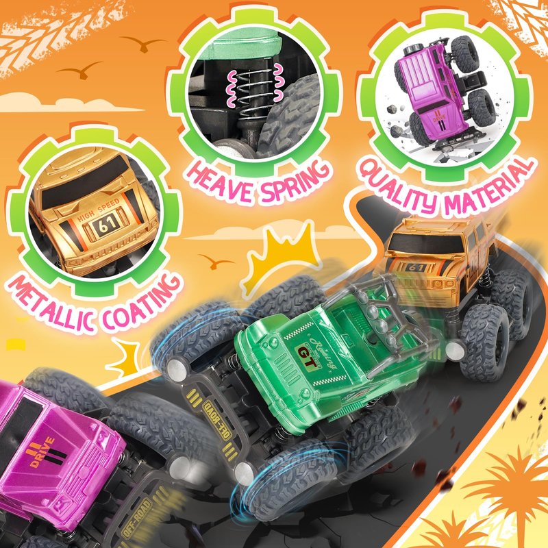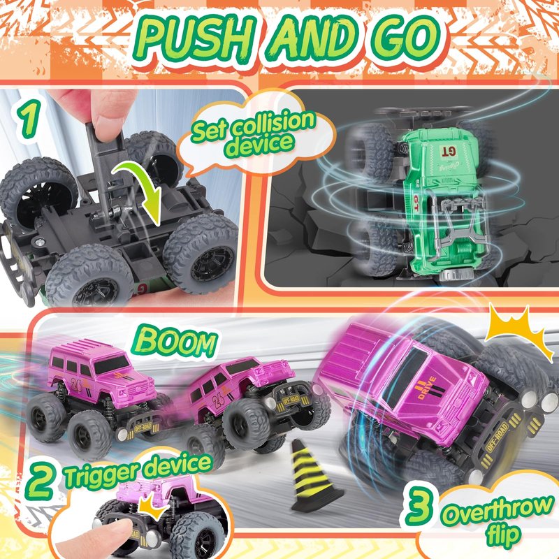 - Push and Go Stunt Cars: Experience a brand new toy cars for kids, the set includes 4 retro metal style toy truck. Switch on the collision device and a collision while driving will activate an automatic side-to-side rollover to experience the fun of a stunt collision that brings hours of excitement and thrilling adventure