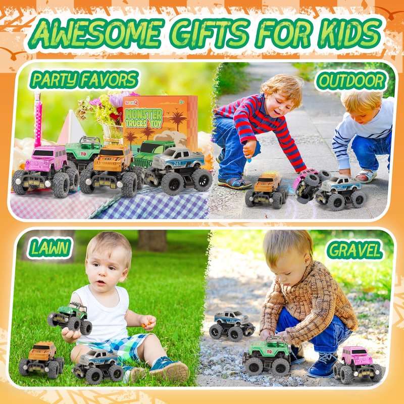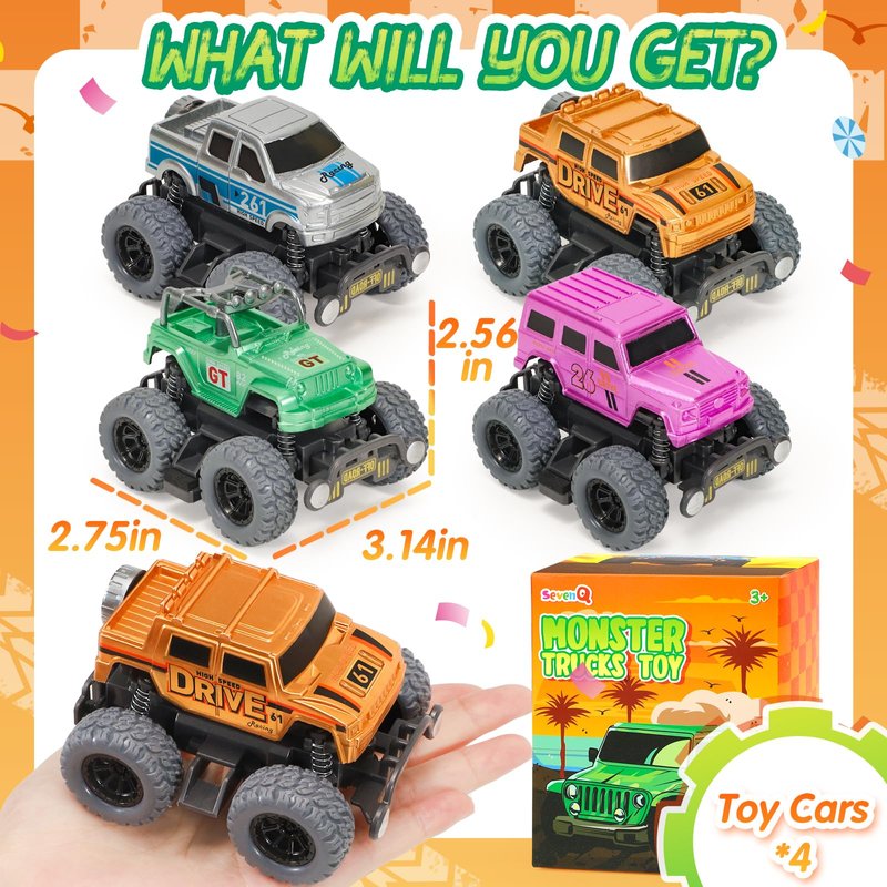 SevenQ Monster Truck Toys for Boys, 4 Pcs Toy Cars Flip Stunt Car, Pull Back Race Cars Party Favors Friction Powered Cars Retro Toddler Toys Vehicles Goodie Bag Stuffers Birthday