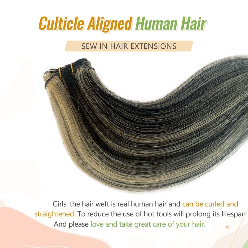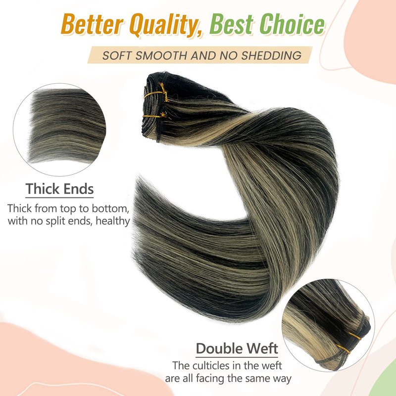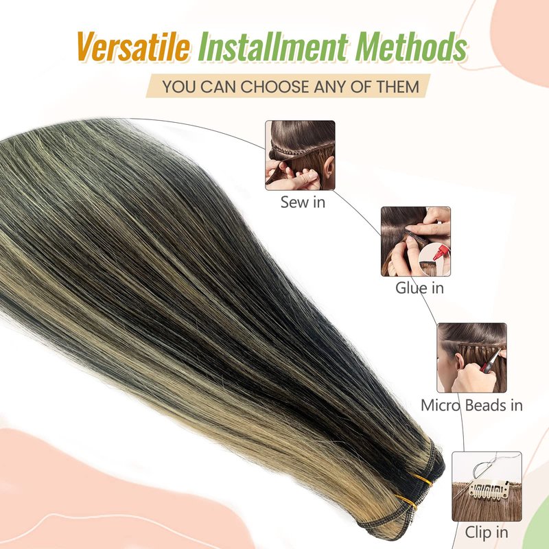 - Multiple Installment Methods for Black with Blonde Shade Hair Weft Extensions: sew in hair extensions real human hair give you more the versatility than traditional hair extensions and can be installed with different ways, directly sew in, micro link in, clip in, tape in or can be used to make a wig; the weft looks natural and realistic, great for all the seasons and for any occasions