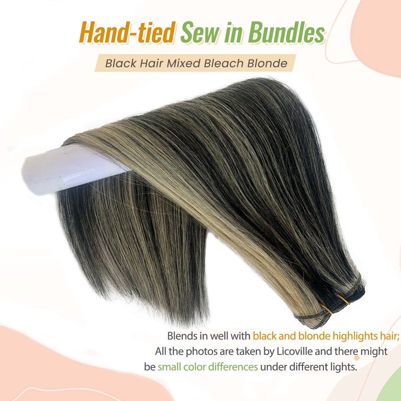 - Black and Blonde Human Hair Extensions Sew in: this color you're viewing is #1/613 jet black mixed with bleach blonde highlights sew in hair wefts; the pictures are taken by Licoville under natural light and there might be small color differences; if you're not sure about color matching, we're always here