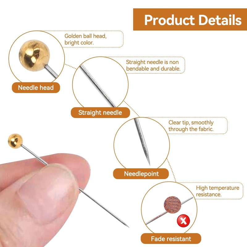 - Gold Ball Head: You can use these sewing pins with gold heads to contrast with the fabric color, sewing pins bulk make your stitching work easier.
