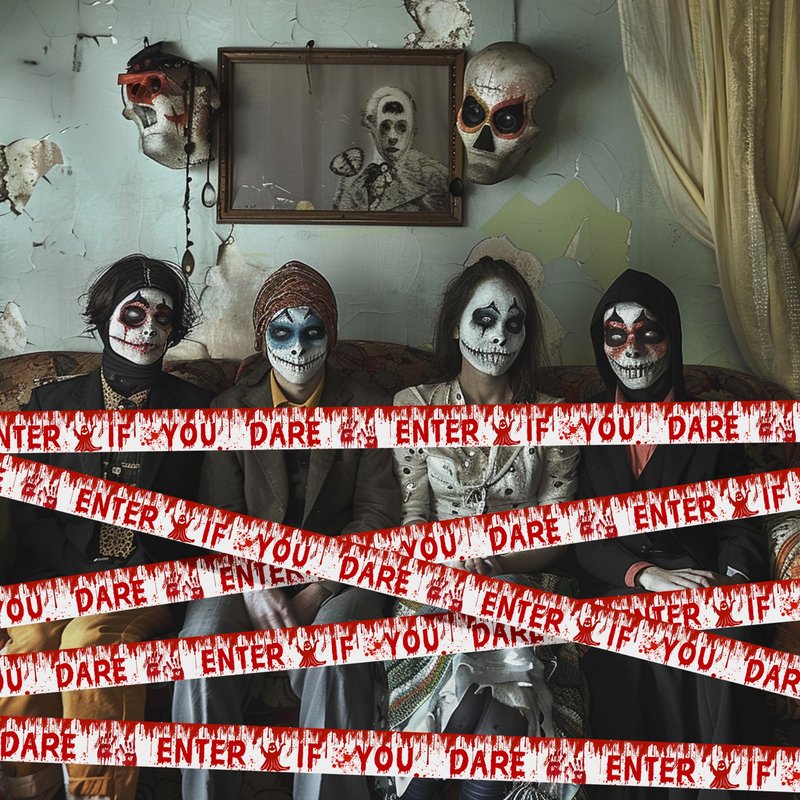 (3)The white background, red ""Enter If You Dare"" bold words with scary bloodstains, warning pranksters or trick-or-treaters not to enter dangerous areas.