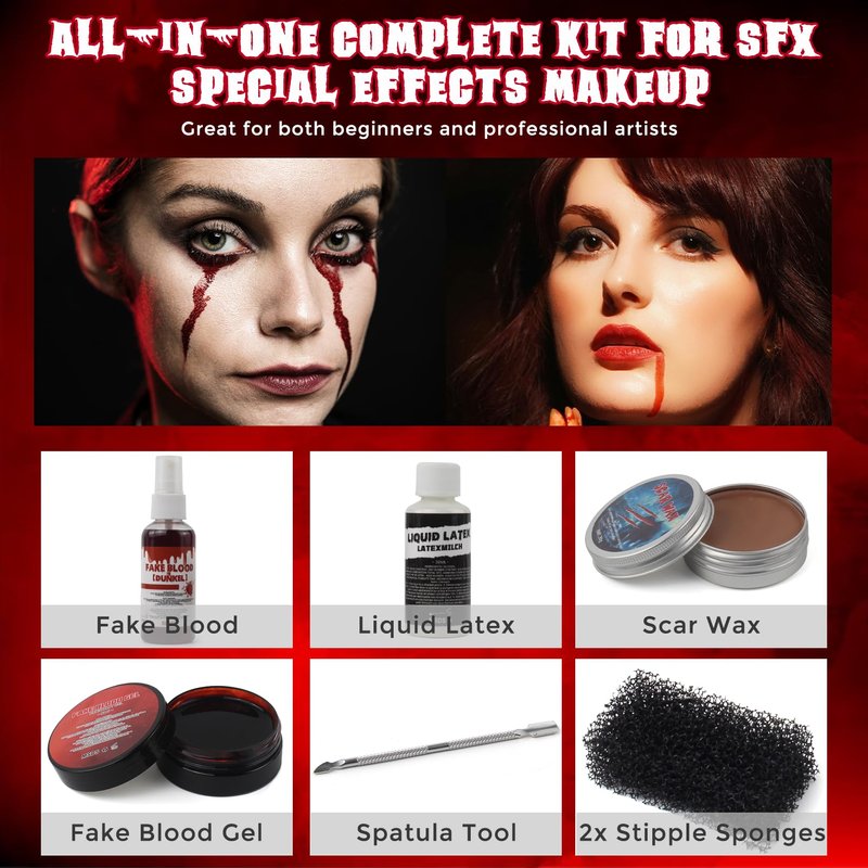 Sfx Makeup Kit Professional, Realistic Special Effects Makeup Kit with 1 Pc Fake Blood, Liquid Latex, Scar Wax, Fake Blood Gel, Spatula Tool and 2 Pcs Stipple Sponges, Washable Halloween Scar Makeup