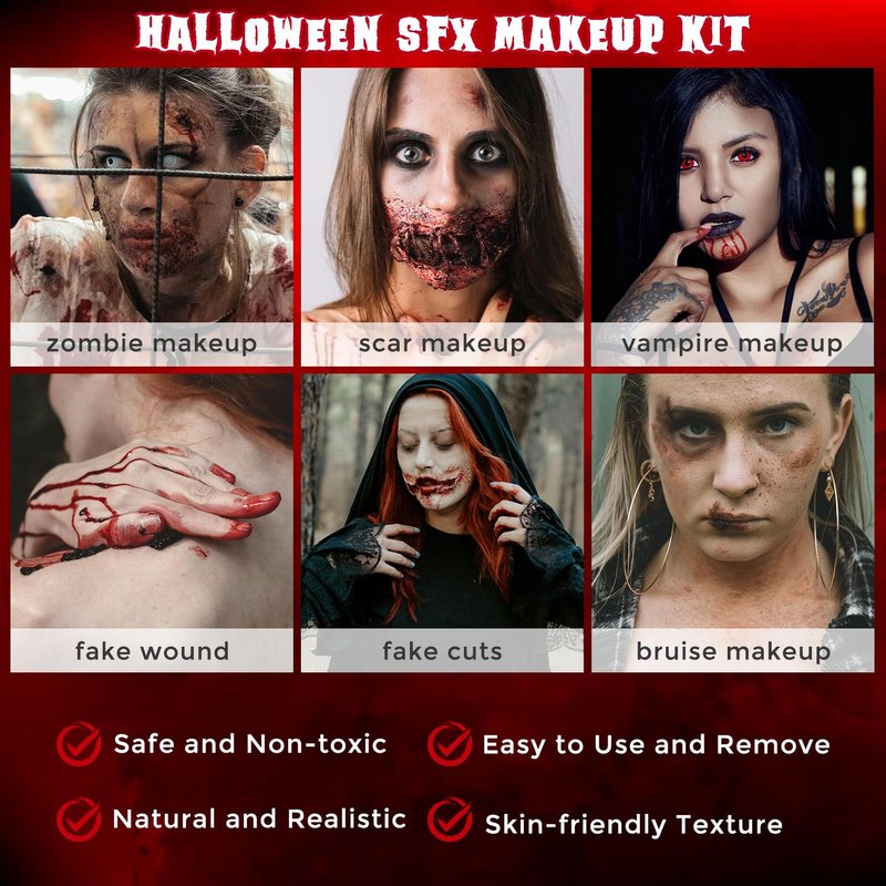 - Perfect for Most Occasion: Our wound makeup kit is not only suitable for professional artists, but also for green hand or enthusiast. It is perfect for Halloween party, Fancy Dress, Carnivals, Festival or TV program special effects and more, to create a gory scene, creepy haunted houses or scary clown makeup