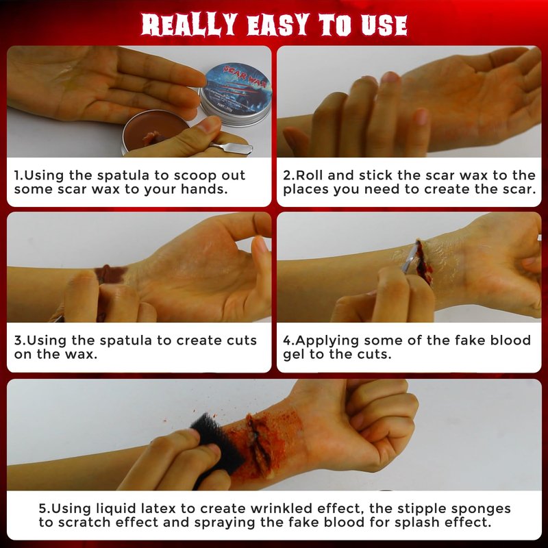 - Easy to Use and Wash: Our scar wax sfx makeup kit is really easy to use with those multifunctional tools included. Firstly, using the spatula to scoop out some scar wax to your hands and then roll and stick it to the places you need to create the scar; Secondly, using the spatula to create cuts on the wax; Thirdly, applying some of the fake blood gel to the cuts; Lastly, using liquid latex to create wrinkled effect, the stipple sponges to scratch effect and spray the fake blood for splash effect for a more real effect. In addition, it is also easy to clean with soap and water as well