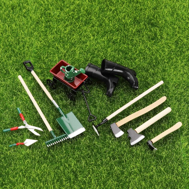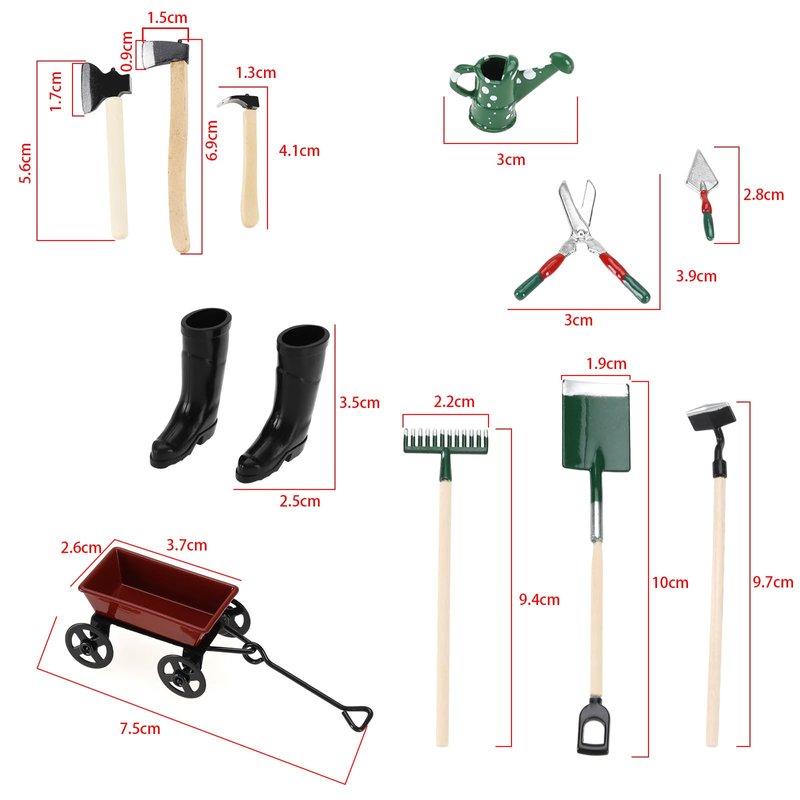 - Miniature Decorations: The set includes 3pcs green farm tools, 3pcs green watering can tools, 3pcs black axes, 2pcs black boots, 1pcs red pull cart.