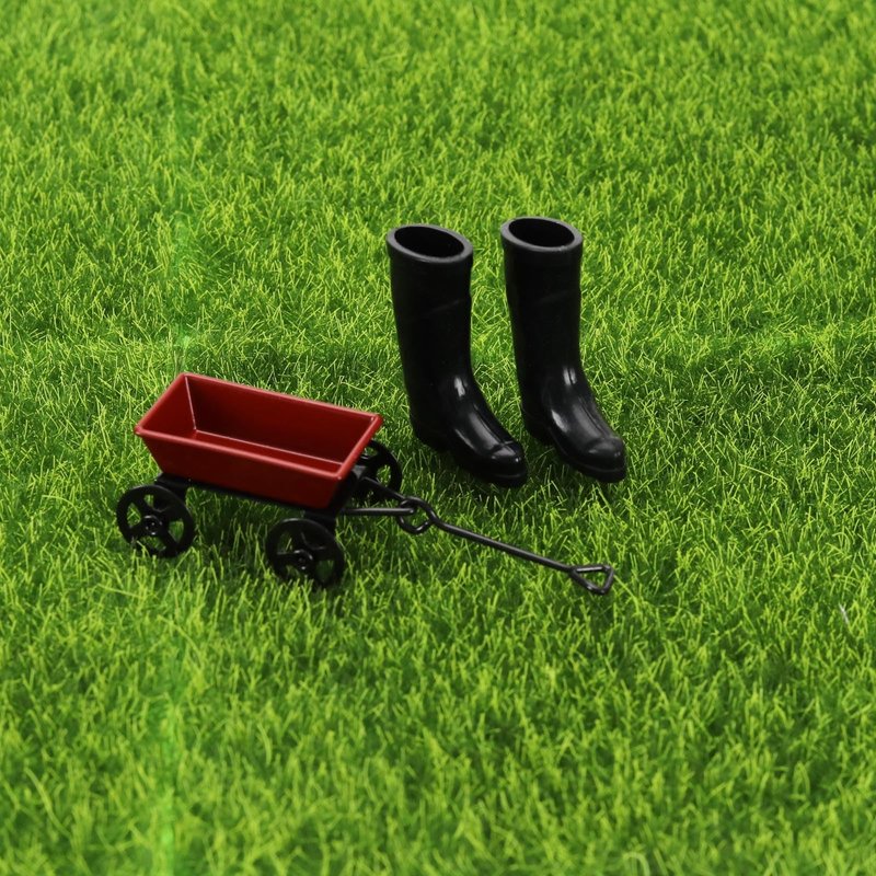 -Miniature Decorations: The set includes 3pcs green farm tools, 3pcs green watering can tools, 3pcs black axes, 2pcs black boots, 1pcs red pull cart.