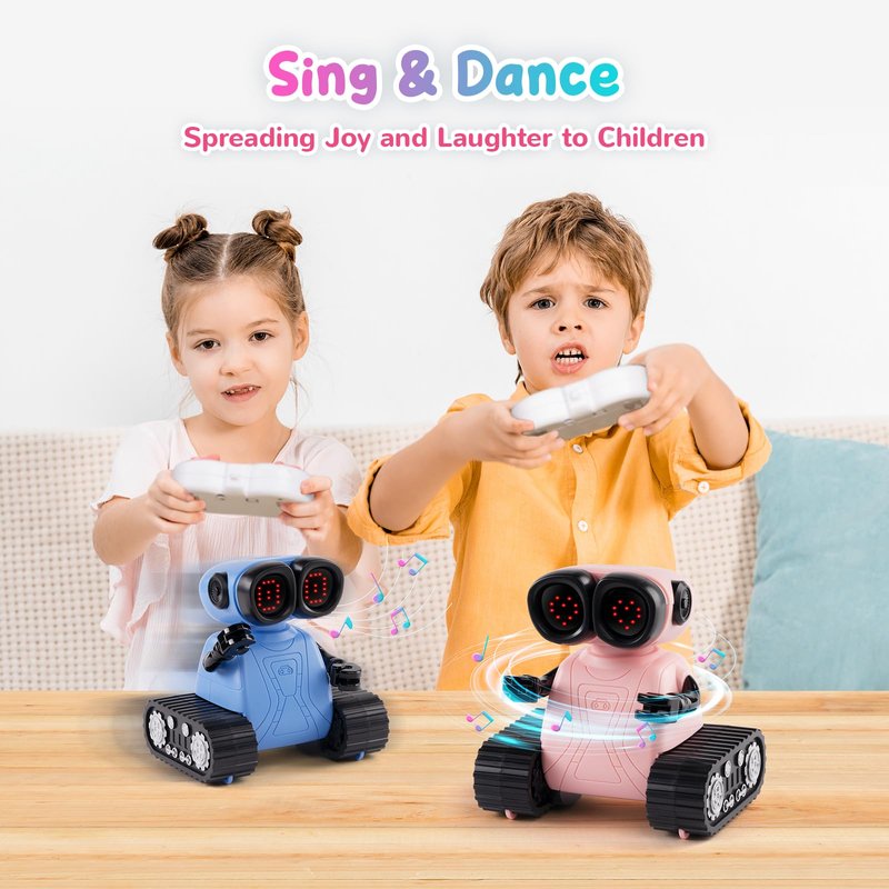 - Adorably Unique Appearance: This super cute and funny robot toy is designed in two parts. The top part is a cute robot with LED eyes and flexible head and arms. The bottom part is a pair of tank tracks with 6 wheels, allowing it to slide, rotate, and spin in place. With its adorable appearance, this robot will bring happiness to children and promote physical and mentally healthy.