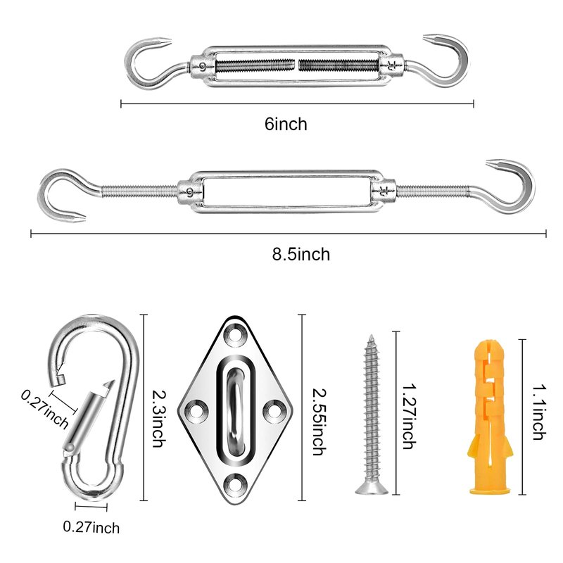 - Top Grade Quality: This patio sun shade kit is made of high-quality 304 /18-8 stainless steel which is extremely durable, sturdy, and rust-proof. With high load carrying capacity and long service life. 6 to 8.5 inch adjustable turnbuckles to create a proper amount of tension, making your shade sails more stable, effectively preventing the sun shade sail from being blow away by rapid winds in bad weather.