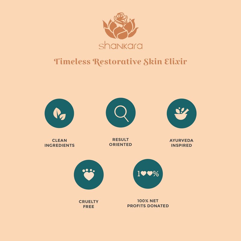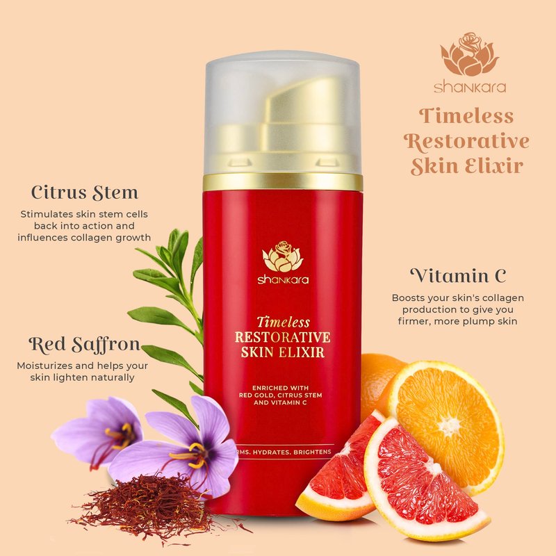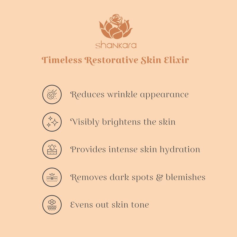 Remove dullness, hyperpigmentation, blemishes, dark circles, sun damage, and signs of aging with Shankara Timeless Restorative Skin Elixir - a 100% active concentrate of serum and face oil! Our anti-aging serum is carefully formulated with a unique blend of skin-revitalizing, and brightening herbs like saffron and sandalwood that work efficiently in improving the appearance of premature wrinkles, dark spots, and dry or patchy skin. Achieve bright, spotless, younger-looking skin safely and naturally!Key Ingredients:-KESAR - RED GOLD SAFFRONSaffron oil for face effectively moisturizes and helps your skin brighten naturally.-CITRUS STEMStimulates skin stem cells back into action and influences collagen growth.-VITAMIN CBoosts your skin’s collagen production for firmer, more supple skin.Benefits:-Enhances skin tone and texture-Locks in hydration, giving a nourished look-Improves the appearance of dark spots and wrinkles-Rejuvenates skin cells-Safe to use dailyHow to Use:Take an equal amount of Kumkumadi oil and Timeless serum in the palm of your hand and mix together, then gently massage into the face and neck. Avoid the area around your eyes. Use in the morning and at night after cleansing.Achieve that fresh, youthful glow naturally with Shankara Timeless Restorative Skin Elixir!