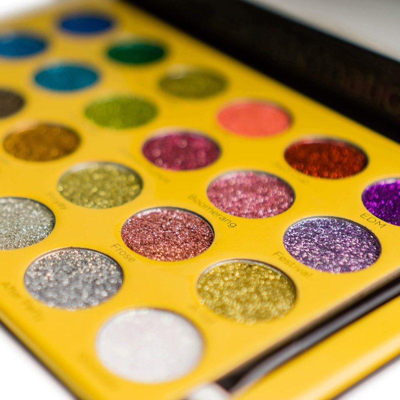 - RSVParty Glitter Eyeshadow Palette Includes: 24 color ultra pigmented gel based makeup glitter pressed eyeshadows with trendy colors great for face or body makeup. Also includes full size dual ended makeup eyeshadow brush. Each eyeshadow pan is 1 inch.