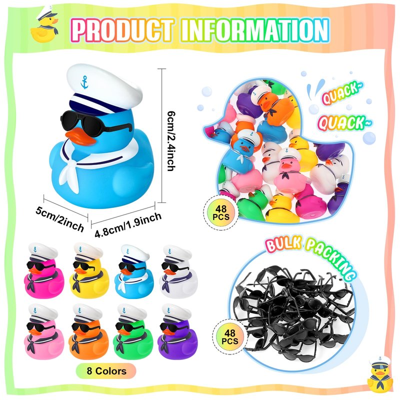 - What's in the Package: you will receive 48 cruise ship ducks, paired with 48 black mini sunglasses, and the ducklings have sound devices installed on the bottom, which can be pressed and squeezed to make a sound, enough to share with family or mates